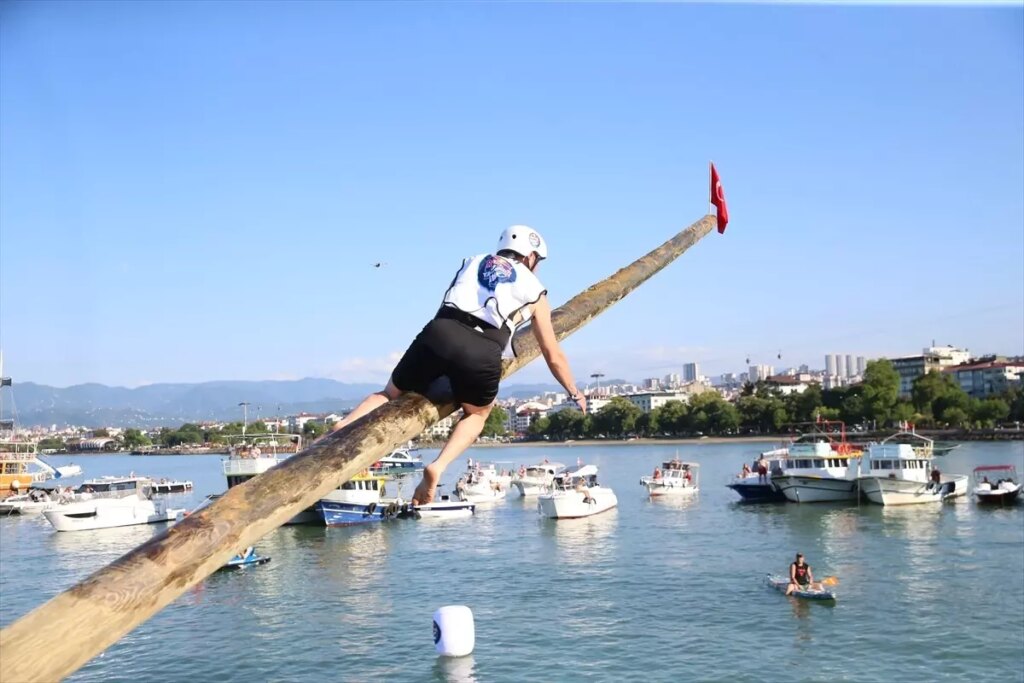 Ordu Büyükşehir Belediyesi işbirliğinde Altınordu ilçesindeki Taşbaşı iskelesinde düzenlenen aktiflikte, yarışmacılar gres yağına bulanmış direğin ucundaki Türk bayrağını almaya çalıştı.